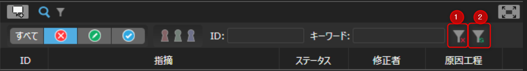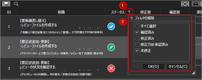 Click the filter symbol (①) for the target item, and select the status to filter by in ②.