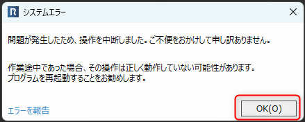 下図赤枠のボタンをクリックしてエラーダイアログを閉じた後で、